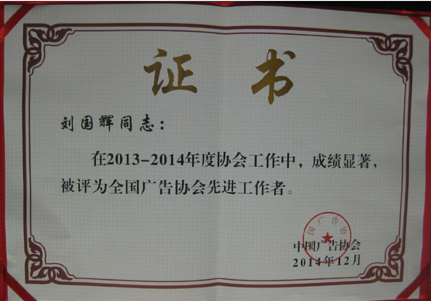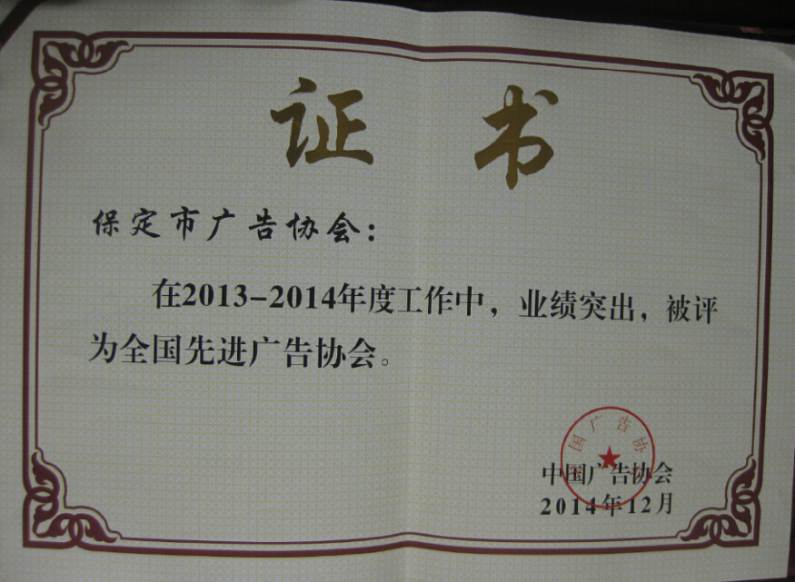 2015年6月15日至16日在北京召开全国广告协会工作暨“双先”表彰会议,保定市广告协会在2013—2014年度中,业绩突出,被中国广告协会评为“全国先进广告协会”;河北省广告协会副秘书长、保定市广告协会秘书长刘国辉同志在2013—2014年度协会工作中,成绩卓著,被中国广告协会评为全国广告协会先进工作者。