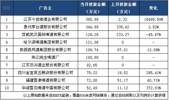 酒业品牌网络广告投放TOP10广告主如下表所示,江苏今世缘、贵州茅台和百威啤酒占据前三名的位置。