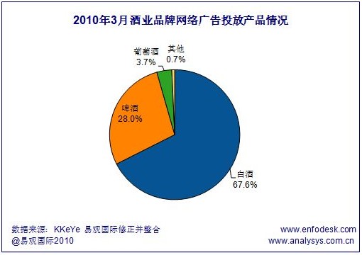 从细分产品来说,本月度只有白酒和啤酒两个种类出现了大幅度品牌网络广告规模的上涨,除此之外威士忌环比跌幅达到100%,所占份额也从上月度的76.5%跌至零点。啤酒类品牌网络广告规模已连续两个月度出现大幅度上涨,天气逐渐转暖引发啤酒消费需求是其上涨主因,但涨幅低于09年同期,年度营销预算集中于重大事件营销是主因。